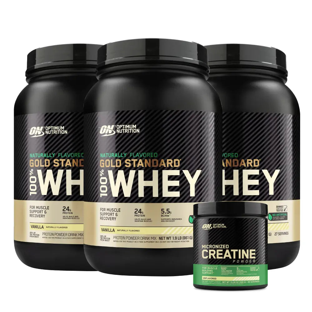 3 unidades Gold Standard 100% Whey Naturally Flavored Optimum Nutrition 1.9 LB + Creatine Micronized Powder Optimum Nutrition 60 servicios