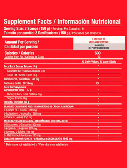 • Ingredientes principales: proteína aislada de suero, proteína concentrada de suero, mezcla de carbohidratos