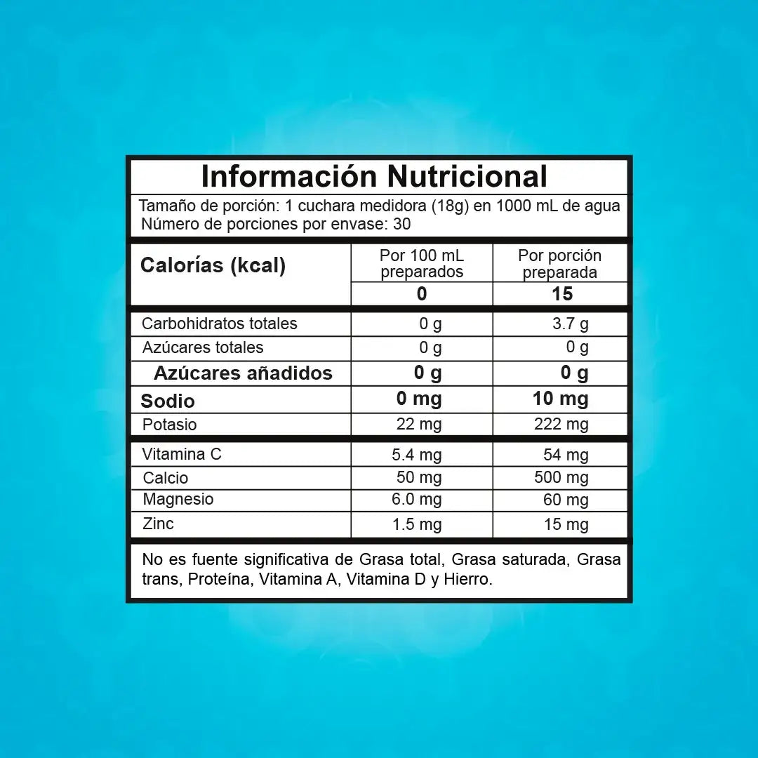 - Modo de preparación: mezclar 1 cuchara medidora (18 g) incluida en el empaque del producto en 5 vasos de agua (1000 ml), agitar hasta obtener un producto homogéneo. Consumir una vez preparado.