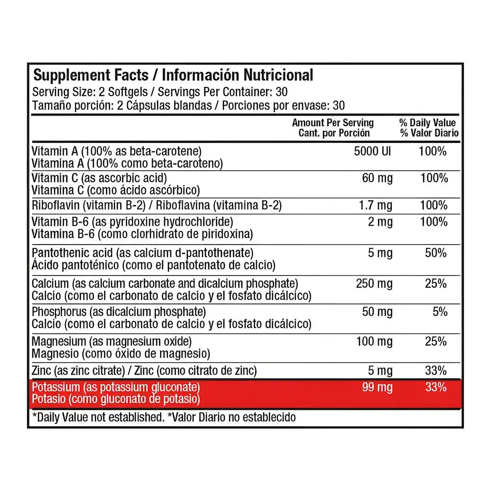 Composición: vitamina A, vitamina C, riboflavina, vitamina B-6, ácido pantoténico, calcio, fosfato, magnesio, zinc, potasio.